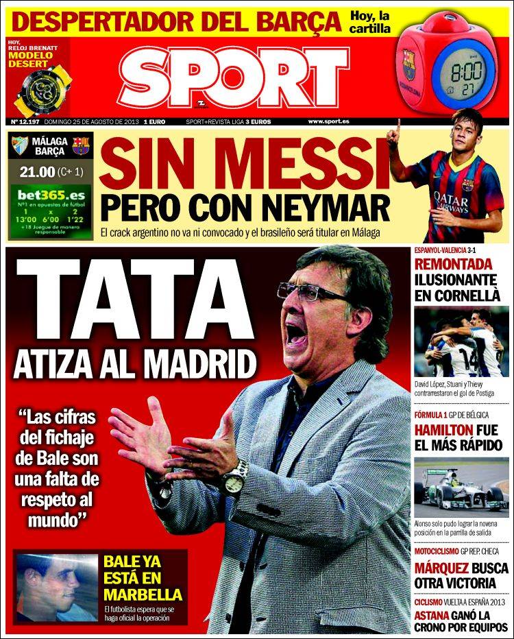 RASSEGNA STAMPA ESTERA SPORT – Prima pagina di Sport all’insegna della polemica. L’allenatore del Barcellona Tata Martino attacca il Real Madrid. Il motivo? L’eccessiva cifra spesa dai madrileni per l’acquisto di Bale.