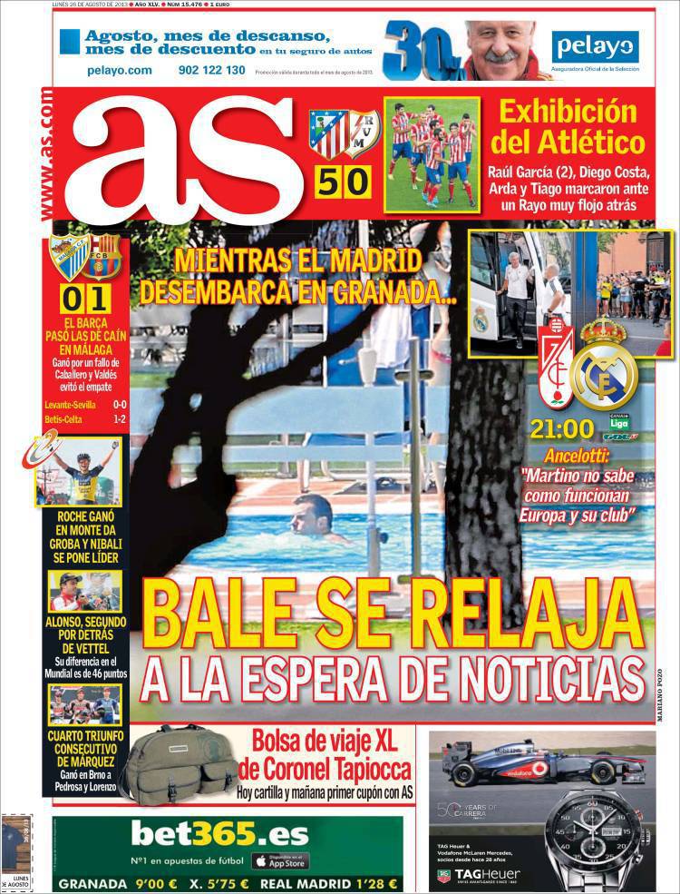 AS BALE – Bale si rilassa in piscina e spera di sapere notizie positive riguardo il suo arrivo al Real Madrid.