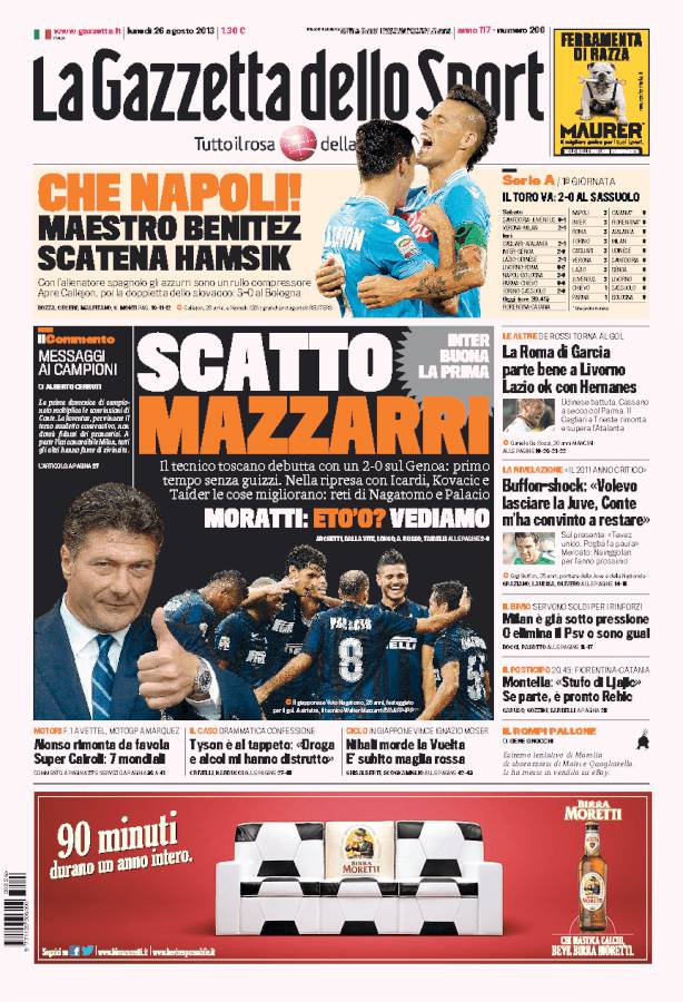 GAZZETTA MAZZARRI – Inizia bene l’Inter di Mazzarri che vince due a zero contro il Genoa.