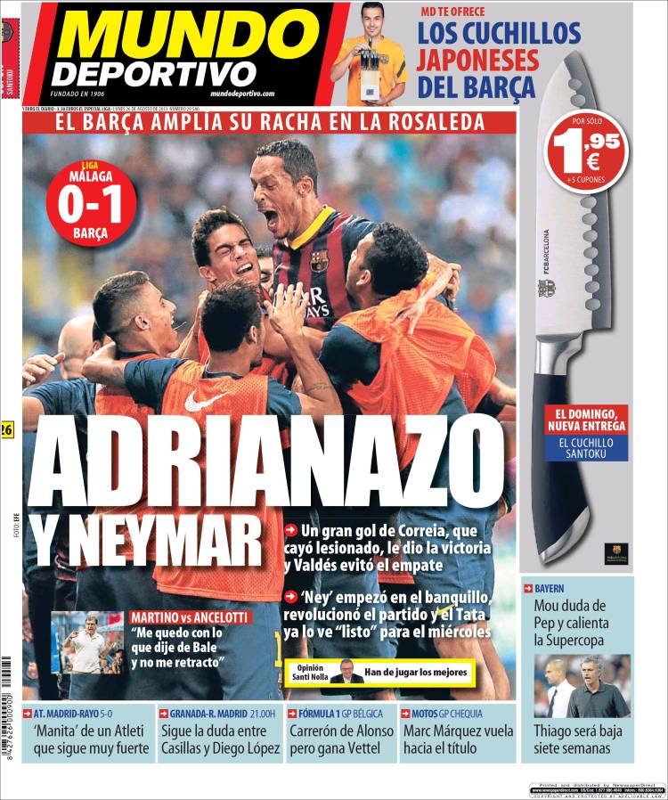 MUNDO DEPORTIVO ADRIANO – Sul quotidiano Mundo Deportivo si parla del Barcellona che vince uno a zero con un gol di Adriano. Bene Neymar.