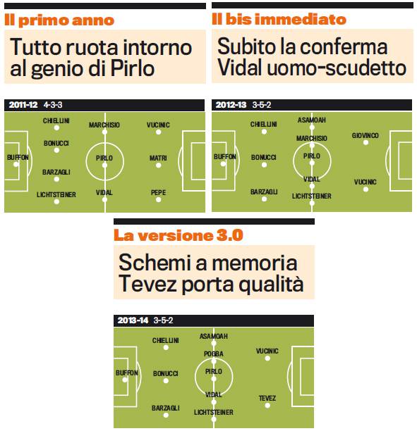 JUVENTUS CONTE CAMBIO MODULO – Una Juventus camaleontica. Questo ha sempre cercato di inculcare Antonio Conte nei propri giocatori da quando è a Torino. Infatti la Juventus ha spesso cambiato modulo passando dal 4-3-3 iniziale al 3-5-2 dei giorni nostri. Si è partiti il primo anno con il 4-3-3 con Pirlo al centro del gioco con Vidal e Marchisio accanto, in attacco Pepe e Vucinic larghi e Matri centrale. Difesa a quattro dietro. Già lo scorso anno qualche cambiamento con il 3-5-2 con Vucinic-Giovinco in attacco, centrocampo con due esterni larghi, Asamoah e Lichtsteiner. Stesso modulo quest’anno però con un Tevez in più.