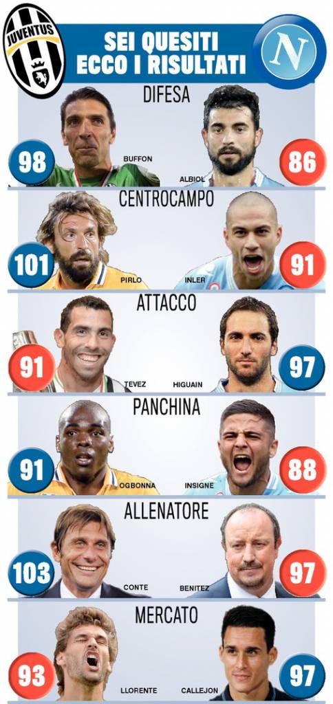 FOTO SONDAGGIO TUTTOSPORT JUVENTUS NAPOLI – Sarà un testa a testa che si protrarrà per tutta la stagione quello tra Juventus e Napoli: chi riuscirà a dominare in campionato? Tuttosport ha pensato bene di chiedere un parere illustre ad una giuria di tutto rispetto: Mauro, Corini, Tacchinardi, Di Livio, Torricelli, Bruscolotti, Taglialatela, Iezzo, Pagliuca, Graziani e Mihajlovic, hanno votato secondo le categorie che notate in grafica, scegliendo bianconeri o azzurri. A vincere nel computo finale è la Juventus di Conte e Marotta, vincente in diverse categorie tra cui la difesa, il centrocampo, la panchina e l’allenatore.