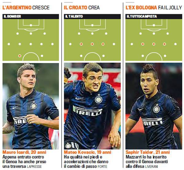 INTER ICARDI KOVACIC TAIDER MAZZARRI – Alla faccia di chi parla di un Mazzarri contrario ai giovani. Il tecnico dell’Inter ha rilanciato i nerazzurri contro il Genoa puntando su tre giovani talenti. Il primo è stato Icardi, entrato nella ripresa che ha dato maggiori timori alla difesa del Genoa cogliendo anche una traversa. Il secondo è stato Kovacic che ha dato fantasia alla manovra nerazzurra. Il giovane croato può diventare super importante per l’Inter. Il terzo giocatore è Taider, appena arrivato dal Bologna, posizionato come vice Cambiasso nella ripresa.