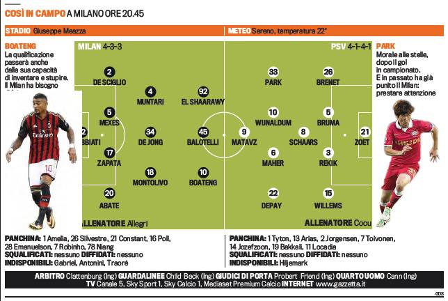 MILAN PSV EINDHOVEN PROBABILI FORMAZIONI – Eccovi le probabili formazioni firmate Gazzetta dello Sport di Milan-PSV Eindhoven, partita che si giocherà questa sera alle ore 20.45 e che sarà valida per il ritorno dei preliminari di Champions League. Il Milan si gioca tutto e Allegri vuole farlo con i titolari classici. In campo, quindi, El Shaarawy dal primo minuto preferito a Robinho. In attacco anche Balotelli e Boateng mentre a centrocampo spazio a Muntari sull’interno sinistra, favorito ad Andrea Poli, l’unico positivo a Verona. In difesa, infine, esordio da titolare per De Sciglio.