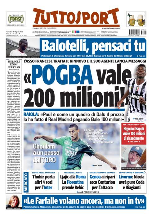 TUTTOSPORT POGBA – L’agente del giocatore, Mino Raiola, rivela il valore del calciatore francese.