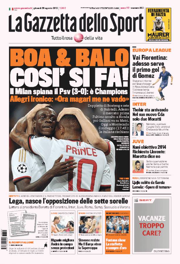 GAZZETTA MILAN – Il Milan batte tre a zero il Psv e vola in Champions League.