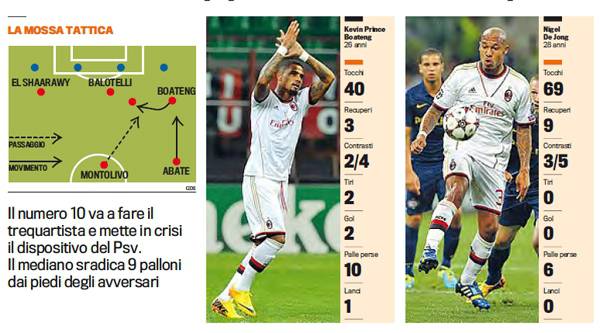 MILAN PSV BOATENG DE JONG BALOTELLI – Finalmente Milan ma soprattutto finalmente Boateng. Ieri il centrocampista ghanese è tornato finalmente ai livelli di qualche anno fa giocando una partita devastante con tanto di doppietta. Boateng parte largo nel tridente ma dopo si accentra per fare il trequartista mettendo in crisi i ragazzi del Psv. In questo modo il Milan fa male alla squadra di Cocu vincendo a centrocampo. Doppietta del ghanese e Champions assicurata. Ma grande lavoro di Nigel De Jong a centrocampo che sradica palloni agli avversari. Bene anche superMario Balotelli.