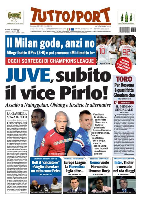 TUTTOSPORT JUVENTUS – Nainggolan, Krstisic o Obiang. Caccia al vice Pirlo.