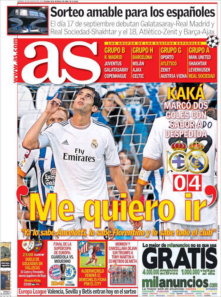 AS KAKA’ – Anche il quotidiano As riporta le parole di Kakà che vuole andare via dal Real Madrid.