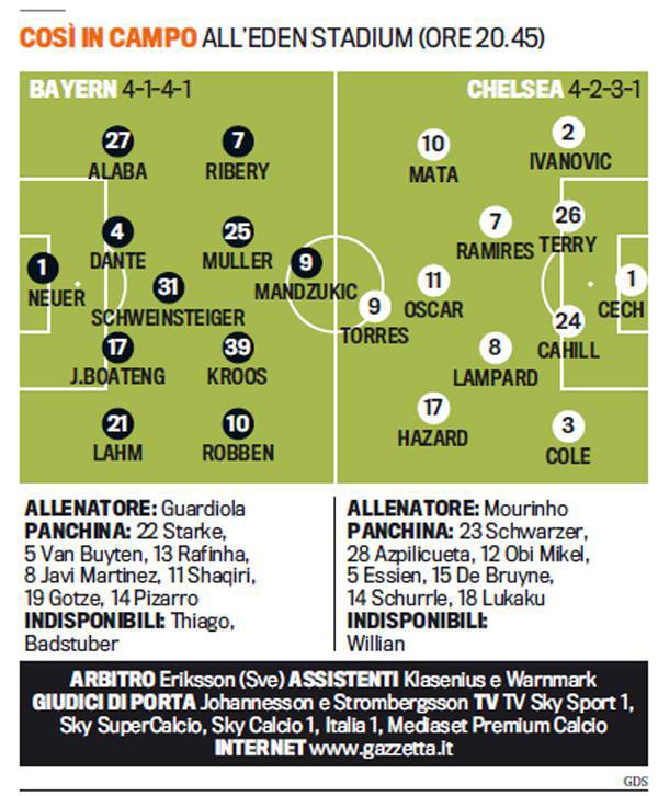 BAYERN MONACO CHELSEA PROBABILI FORMAZIONI SUPERCOPPA EUROPEA – Ritorna la grande sfida tra Guardiola e Mourinho, questa sera si sfideranno con i rispettivi club, Bayern Monaco e Chelsea, per la conquista della Supercoppa Europea. I tedeschi giocheranno con il 4-1-4-1 con Mandzukic prima punta, sostenuto da dietro da Ribery, Kroos, Muller e Robben. Il Chelsea risponde con il 4-2-3-1 con Torres unica punta e dietro tre trequartisti, Mata, Oscar e Hazard. Un match che promette spettacolo, Guardiola a caccia del primo titolo con il Bayern Monaco, Mourinho che ha voglia di battere il grande avversario. Formazioni secondo la Gazzetta dello Sport.