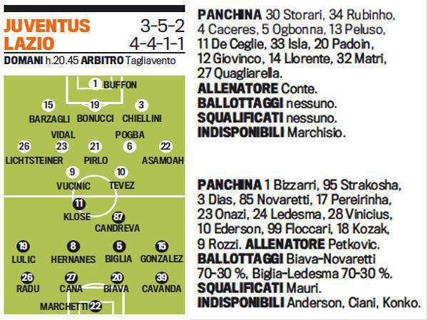 JUVENTUS LAZIO PROBABILI FORMAZIONI LLORENTE TEVEZ VUCINIC – Domani sera anticipo della seconda giornata tra Juventus e Lazio. Antonio Conte continua a rimandare l’esordio in Serie A dal primo minuto di Fernando Llorente, ancora bocciato il bomber spagnolo. Davanti giocheranno Tevez con Vucinic, confermata la squadra che ha battuto la Sampdoria uno a zero nella prima giornata. La Lazio invece giocherà con Candreva dietro l’unica punta Klose, con Biglia ed Hernanes centrali di centrocampo, Lulic e Gonzalez sulle fasce. Ritorna la coppia titolare Cana-Biasa in difesa. Ecco le probabili formazioni secondo la Gazzetta dello Sport.