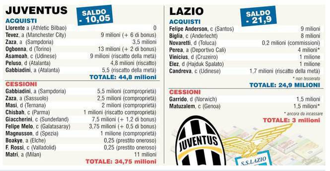 JUVENTUS LAZIO INVESTIMENTI – Questa sera si giocherà la seconda giornata di campionato e Juventus e Lazio si ritroveranno di fronte dopo l’aperitivo della Supercoppa Italia. Adesso vogliamo però porre l’attenzione, come si vede dalla foto tratta da Tuttosport, sulla differenza degli investimenti dei due club. Quello bianconero ha un saldo in negativo di 10,5 milioni di euro mentre quello biancoceleste addirittura di 21,9! La motivazione è presto detta: ai numerosi acquisti di entrambe le squadre, la Juventus ha saputo rispondere con cessioni importanti capaci di ammortizzare il tutto mentre la Lazio ha ceduto soltanto Garrido e Matuzalem che in due hanno fruttato appena 2 milioni. Spiccioli, poca roba. Gli acquisti dei capitolini hanno superato il valore delle cessioni quindi ecco perchè fra le due squadre troviamo una simile differenza di investimenti.