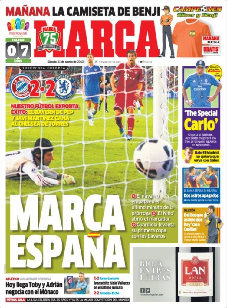 Marca: Marchio spagnolo 31/08/2013 di Admin3 MARCA BAYERN CHELSEA – Sul quotidiano Marca si parla della Supercoppa Europea tra Chelsea e Bayern vinta ai rigori da Guardiola contro Mourinho. La redazione di Calciomercatonews.com
