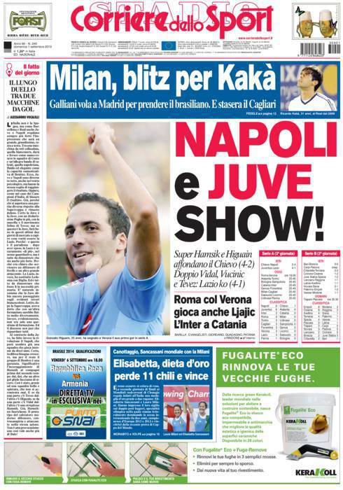 PRIMA PAGINA CORRIERE DELLO SPORT – L’argomento di giornata è rappresentato dalle grandi vittorie ottenute da Napoli e Juventus negli anticipi di ieri. Anche il Corriere dello Sport va a sottolineare i due poker rifilati rispettivamente a Chievo e Lazio. Tra gli azzurri in evidenza Hamsik e Higuain, al suo primo gol ufficiale con la sua nuova maglia, mentre allo Juventus Stadium è Vidal ad attirare l’attenzione con la sua doppietta.