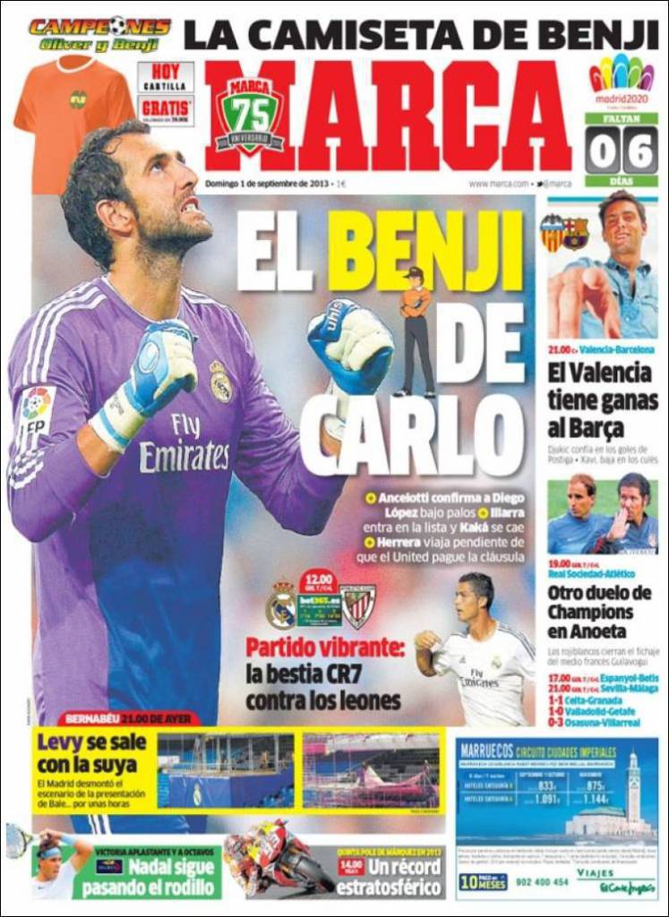 RASSEGNA STAMPA MARCA – Tra poco meno di tre ore, alle 12, il Real Madrid scenderà in campo al Santiago Bernabeu per affrontare l’Athletic Bilbao. Come sottolineato dall’edizione odierna di Marca, Carlo Ancelotti vuole dare fiducia al trentunenne Diego Lopez e lo confermerà titolare tra i pali. Il tecnico delle Merengues lascerà quindi Casillas nuovamente in panchina.