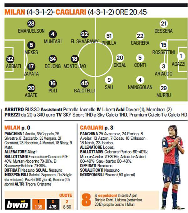 MILAN CAGLIARI PROBABILI FORMAZIONI – Dimenticare la sconfitta con il Verona e ripartire dal successo ottenuto contro il PSV. Il Milan è pronto a scendere in campo questa sera per regalare ai suoi tifosi la prima vittoria casalinga in campionato. Tre novità di formazione rispetto a mercoledì sera, come riportato dalla Gazzetta dello Sport. Come terzino sinistro agirà De Sciglio in luogo di Emanuelson, mentre in mediana Poli prenderà il posto di Montolivo che, in attesa di Kakà, giocherà da trequartista alle spalle del duo Balotelli-El Shaarawy. Dall’altra parte c’è la lanciatissima coppia d’attacco Pinilla-Sau. Panchina per Astori, al centro di numerose voci di mercato che lo accostano anche ai rossoneri.