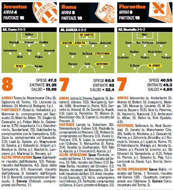 CALCIOMERCATO SERIE A VOTI NAPOLI JUVENTUS – La Gazzetta dello Sport ha stilato le pagelle del mercato delle maggiori squadre italiane. Primo posto per la Juventus di Antonio Conte che ha preso un campione come Tevez e si è assicurata anche Llorente, solo che lo spagnolo per il momento è rimasto fuori dal progetto Conte. I bianconeri hanno anche confermato i maggiori campioni. Anche il Napoli prende un 8 in pagella con acquisti importanti fatti dal presidente De Laurentiis, in primis Higuain e poi Callejon e Martens. Bene anche Roma, Fiorentina e Milan, tutti e tre voto 7 in pagella. L’Inter invece prende 6,5.