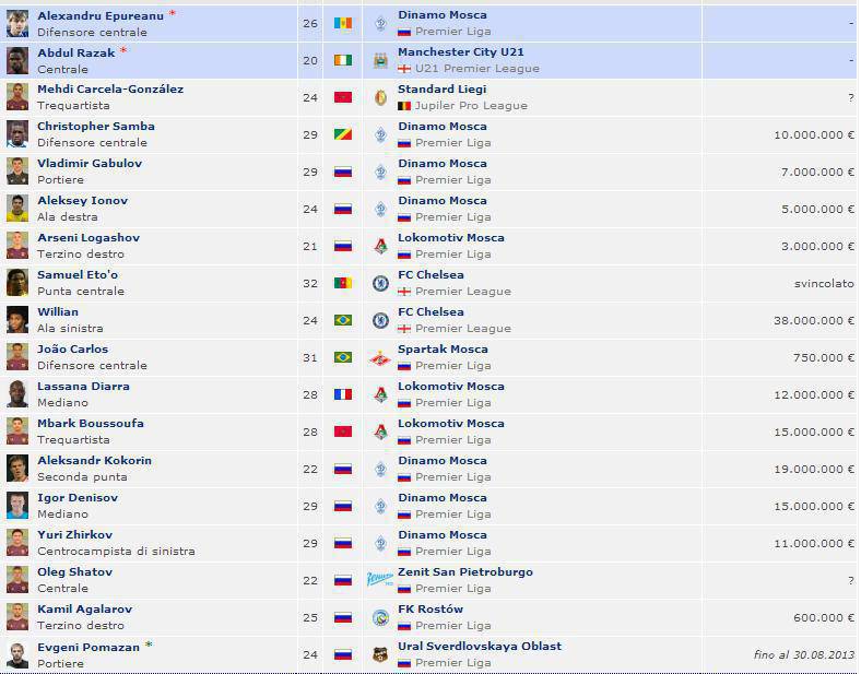 CALCIOMERCATO ANZHI FOTO – Si era candidata come una delle squadre dall’obiettivo più prestigioso, proprio come il Manchester City e il Psg ma qualcosa è andato storto, i risultati non sono arrivati e l’impero costruito dai magnati russi si è via via smantellato. E’ la rocambolesca storia dell’Anzhi di Samuel Eto’o, simbolo di una squadra ormai decaduta in tutto e per tutto. Basta guardare la foto (fonte Transfermarkt.it) delle cessioni del club russo. Con l’addio dei suoi giocatori migliori l’Anzhi ha guadagnato qualcosa come 136 milioni di euro! Fra i top player svenduti troviamo Willian  e lo stesso Eto’o senza scordarci di Denison e Diarra. Ma si sa, i debiti da pagare erano altissimi…