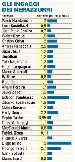FOTO INTER MILITO CAMBIASSO – La rivoluzione Inter passa anche, e soprattutto, dall’abbassamento del tetto ingaggi della squadra nerazzurra. Dopo l’addio di quasi tutti i big che hanno reso grande la squadra nerazzurra grazie alla vittoria del triplete, gli unici a percepire uno stipendio sopra i 3 milioni sono Esteban Cambiasso e Diego Milito, come ci testimonia questa interessante grafica del Corriere dello Sport. Contenuti gli ingaggi dei nuovi giovani come Icardi, Belfodil, Kovacic e Juan Jesus, che si aggirano tutti intorno al milione di euro. Con Thohir però le cose potrebbero cambiare, con un innalzamento del tetto ingaggi del club nerazzurro. Al momento però, il primo obiettivo del magnate indonesiano, parrebbe essere il ripianamento del rosso di bilancio…