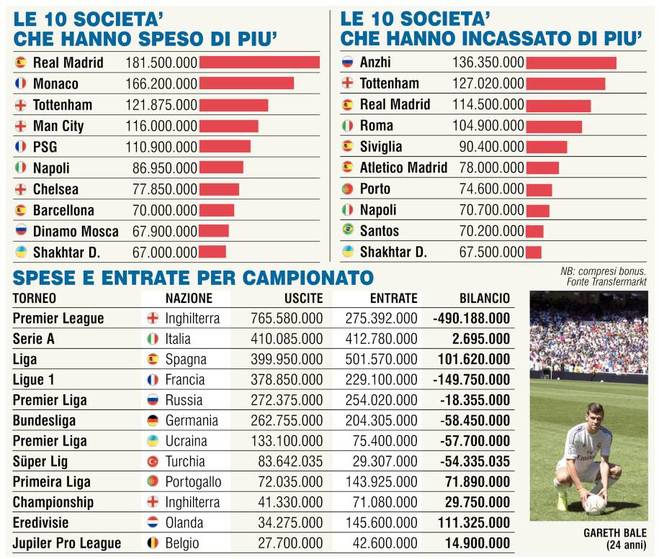 FOTO CALCIOMERCATO SPESO DI PIU’ MENO DIFFERENZA – Dopo 3 mesi di scambi, trattative, bufale di mercato, ingaggi, plusvalenze e chi più ne ha più ne metta, è terminata la sessione estiva di calciomercato. Una sessione che ha riportato il calcio italiano, grazie ad alcuni colpi di caratura internazionale, ad un livello che più la rispecchia rispetto agli scorsi anni. Il Corriere dello Sport ha voluto realizzare un’interessante grafica che mette in fila le società che hanno speso di più, quelle che hanno più incassato ed anche il rapporto tra cessioni ed acquisti dei vari campionati europei. Real Madrid, Anzhi e la Premier League, comandano queste tre rispettive classifiche.