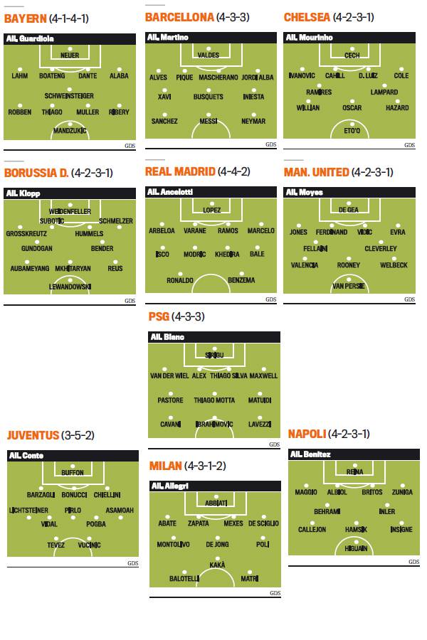 MILAN JUVENTUS NAPOLI EUROPA – La Champions League inizierà tra due settimane circa, le tre squadre italiane cercheranno di dare fastidio alle big europee. Oggi la Gazzetta dello Sport ha messo a confronto le formazioni delle grandi d’Europa che potrebbero vincere la Champions. C’è il Bayern Campione in carica che ha cambiato guida tecnica, ora c’è Guardiola con il suo calcio spettacolare. Attenzione anche a Chelsea e Psg, oltre al giovane Borussia Dortmund. Ovviamente ci sono anche le spagnole, entrambe con allenatori nuovi. Infine il Manchester United con Rooney rimasto alla base. Ecco le formazioni delle big.