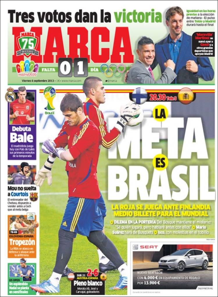 RASSEGNA STAMPA ESTERA MARCA – La Spagna di Del Bosque si gioca la qualificazione ai Mondiali 2014 in Brasile contro la Finlandia. Anche il C. T. spagnolo è alle prese con il problema portiere: ballottaggio tra Casillas e Valdes.