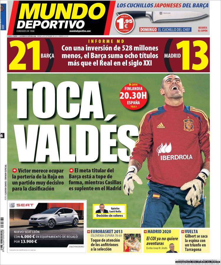 RASSEGNA STAMPA MUNDO DEPORTIVO – Contro la Finlandia, in una gara valida per le qualificazioni ai Mondiali 2014, il C.T. della Spagna, Del Bosque si affida al portiere del Barcellona, Valdes, preferito a Casillas che continua a vivere un momento negativo nonostante l’arrivo di Carlo Ancelotti sulla panchina del Real.
