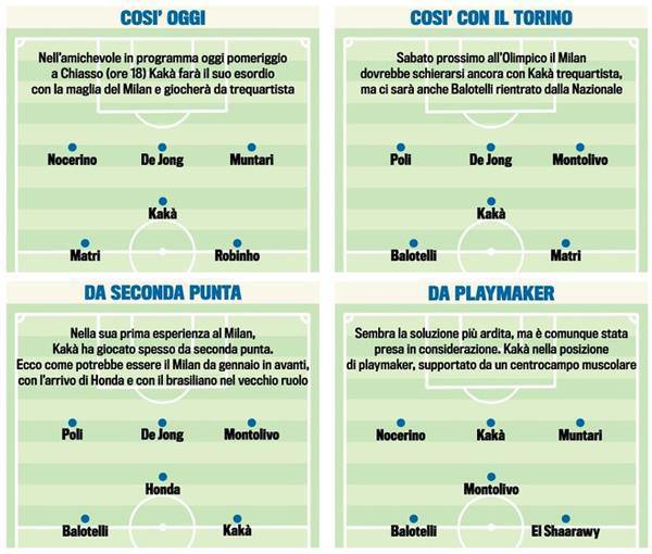 FOTO MILAN KAKA’ – Il ritorno al Milan di Ricardo Kakà, impone dover modificare alcune situazioni tattiche per la fase offensiva del Milan. L’arrivo del campione brasiliano, porta la scelta di dover abbandonare definitivamente il 4-3-3 che tanto bene aveva portato alla squadra rossonera nella scorsa stagione, a favore di un 4-3-1-2, già deciso in sede di riunioni con tra Galliani, Berlusconi ed Allegri. Tuttosport, in edicola stamani, ha ipotizzato 4 possibilità di inserimento in rosa di Kakà: un ruolo da trequartista insieme a Matri e Robinho, uno con Balotelli e Matri, un altro da seconda punta ed infine uno da regista di centrocampo…