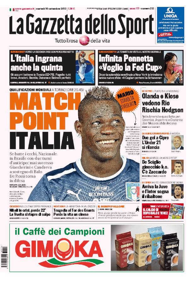 GAZZETTA ITALIA – Sulla Gazzetta dello Sport si parla dell’Italia che questa sera giocherà contro la Repubblica Ceca. Se vince stacca il biglietto per il Brasile.