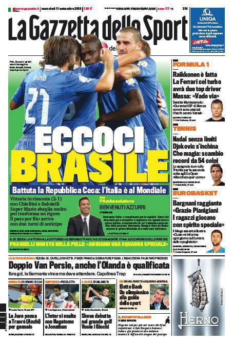 LA GAZZETTA DELLO SPORT PRIMA PAGINA – Di seguito la prima pagina de La Gazzetta dello Sport di oggi, 11 settembre 2013: