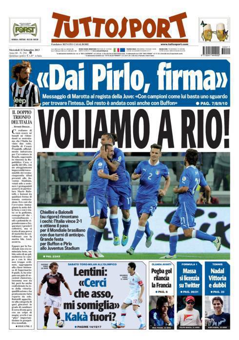 TUTTOSPORT PRIMA PAGINA – Di seguito la prima pagina di Tuttosport di oggi, 11 settembre 2013: