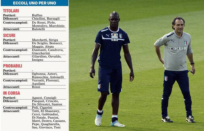 ITALIA CONVOCATI BRASILE – Il Mondiale in Brasile si sta avvicinando. L’Italia si è qualificata alla competizione con due turni di anticpo. In ogni caso, come riportato da Il Corriere dello Sport, ecco una prima lista di giocatori che potrebbero essere convocati da Prandelli. In foto si possono leggere i sicuri e gli incerti. Fra questi figura anche Stephan El Shaarawy, attaccante del Milan che da titolare inamovibile si è trasformato prima in riserva poi addirittura in un possibile escluso. Gli altri incerti riguardano soprattutto il reparto offensivo. Parlando invece dei sicuri, presenti Diamanti, Balotelli, Buffon, Gilardino e la maggior parte della tradizionale ossatura che Prandelli ha dato all’Italia durante le qualificazioni.