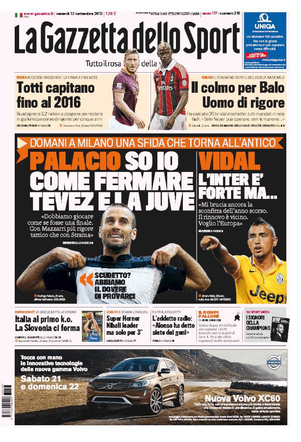 RASSEGNA STAMPA GAZZETTA DELLO SPORT – Domani a San Siro, una sfida che torna all’antico. Palacio: “Dobbiamo giocare come se fosse una finale. Con Mazzarri più rigore tattico che con Stramaccioni”. Vidal: “Mi brucia ancora la sconfitta dell’anno scorso. Il rinnovo è vicino. Voglio l’Europa”. Totti capitano fino al 2016. Il colmo per Balo: uomo di rigore.