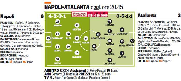 NAPOLI ATALANTA PROBABILI FORMAZIONI HAMSIK MERTENS FOTO – Rafa Benitez, tecnico del Napoli, lo aveva già detto alla vigilia. Contro l’Atalanta ci sarà turnover visti gli impegni delle Nazionali e soprattutto in vista della Champions con la sfida contro il Borussia Dortmund. Per questo almeno all’inizio Marek Hamsik partirà dalla panchina, il centrocampista slovacco non dovrebbe giocare dall’inizio. Al suo posto Pandev, mentre a sinistra ci sarà il debutto di Mertens dal primo minuto, in attacco confermato Higuain. Rientra Cannavaro in difesa. Nell’Atalanta l’ex Denis cercherà di dare una delusione ai suoi vecchi tifosi. Probabili formazioni secondo la Gazzetta dello Sport.