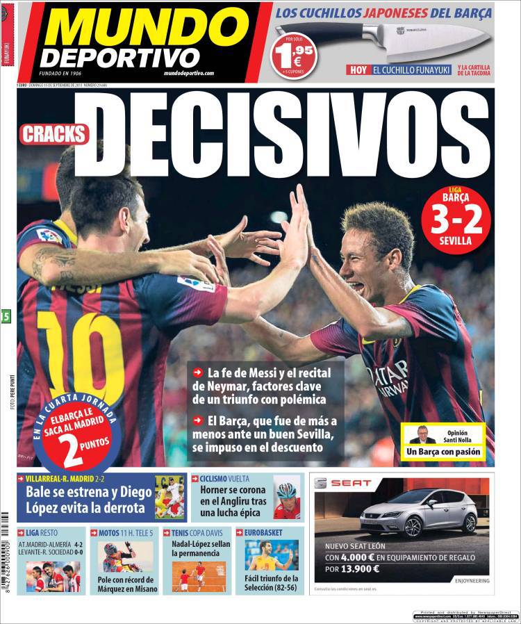 RASSEGNA STAMPA ESTERA MUNDO DEPORTIVO – Nell’anticipo della quarta giornata della Liga, il Barcellona ottiene una vittoria in extremis. Contro il Siviglia, dopo le reti di Dani Alves e Leo Messi e il pareggio degli ospiti, ci pensa Alexis Sanchez al 94′ a ristabilire il vantaggio. Buona la prestazioni di Messi, Sanchez e Neymar, come sottolineato da Mundo Deportivo.