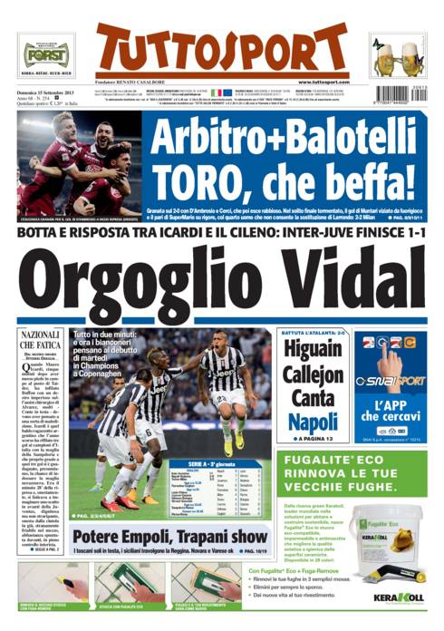 RASSEGNA STAMPA TUTTOSPORT – Il quotidiano torinese Tuttosport si sofferma sul pareggio ottenuto ieri dalla Juventus, spazio quindi a Vidal in copertina. E’ proprio il centrocampista cileno che, con il suo gol, ha permesso ai bianconeri di non cadere al Meazza, contro un’Inter andata in vantaggio grazie a Icardi.