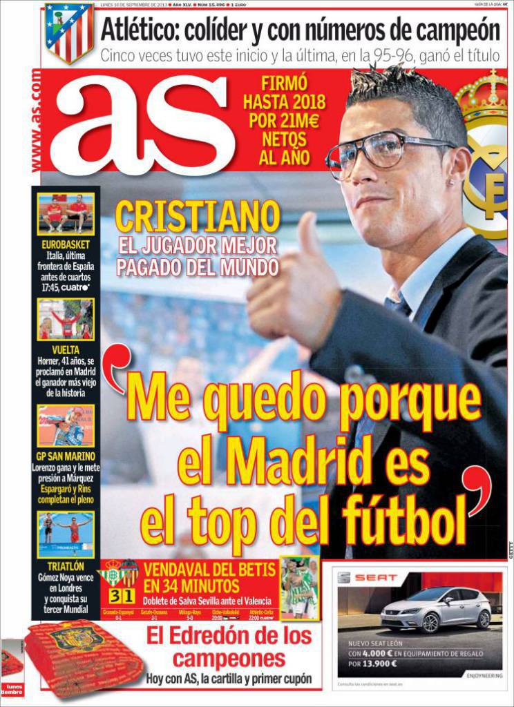AS REAL MADRID – Sul quotidiano As si parla di Ronaldo che ha rinnovato fino al 2018 con il Real Madrid.