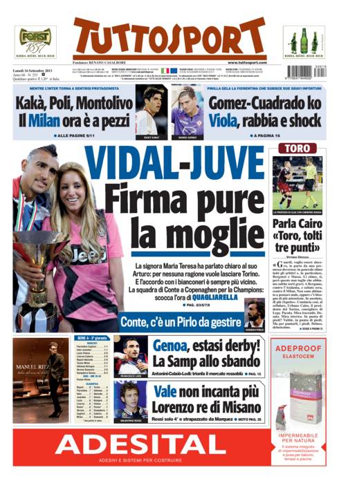 TUTTOSPORT VIDAL JUVENTUS – Su Tuttosport si parla di Vidal che presto firmerà il rinnovo con la Juventus. Lo chiede anche la moglie.