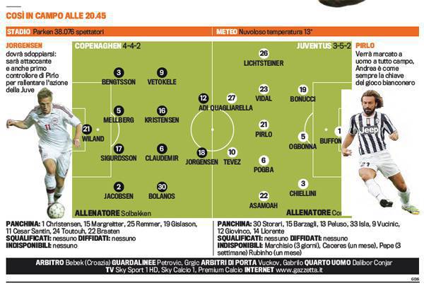COPENHAGEN JUVENTUS QUAGLIARELLA OGBONNA – Inizia ufficialmente la Champions League 2013-2014 per la Juventus di Antonio Conte. Il tecnico bianconero conferma l’undici della vigilia con Quagliarella in campo accanto a Tevez. La vera novità è in difesa dove Barzagli non recupera per questo ci sarà il debutto ufficiale di Angelo Ogbonna come centrale difensivo con Chiellini a sinistra e Bonucci a destra. A centrocampo i soliti cinque che hanno giocato anche contro l’Inter. Curiosità nei danesi, gioca l’ex bianconero Mellberg al centro della difesa. Ecco le formazioni secondo la Gazzetta dello Sport.