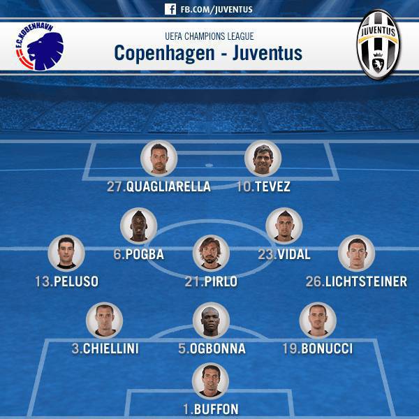 COPENAGHEN JUVENTUS FORMAZIONI UFFICIALI – Di seguito le formazioni ufficiali di Copenaghen-Juventus. Novità sulla sinistra in casa bianconera dove c’è Peluso al posto di Asamoah. Resto dell’11 come da anticipazioni.