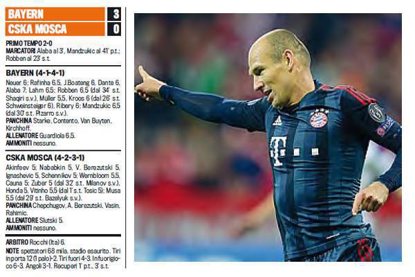 BAYERN MONACO CSKA MOSCA GAZZETTA DELLO SPORT – Ha iniziato la nuova Champions League, proprio come aveva chiuso la scorsa il Bayern Monaco: con una vittoria. Cambia il mister, non cambia l’attitudine alla vittoria: da Heynckes a Guardiola, la squadra bavarese non ha cambiato la propria filosofia e la propria mentalità. Una vittoria importante e di valore ieri sera contro il Cska Mosca, arrendevole nell’affrontare i campioni d’Europa. Ecco i voti e le pagelle della gara, a firma della Gazzetta dello Sport, che testimoniano il dominio della squadra che in questa edizione della Champions League cercherà di difendere il titolo conquistato lo scorso maggio.