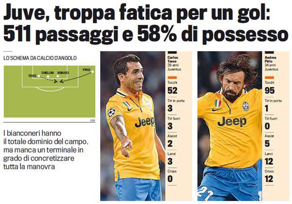 COPENHAGEN JUVENTUS STATISTICHE GOL PASSAGGI – Niente, ancora una volta la Danimarca è indigesta per la Juventus di Antonio Conte. I bianconeri pareggiano uno a uno contro il Copenhagen facendo tanta fatica a segnare il gol del pareggio con Fabio Quagliarella. Il centravanti bianconero ha segnato dopo il gol dei danesi, ma la Juventus non ha saputo tramutare in rete le tante azioni. Il possesso palla ha visto la Juventus stradominare con il 58% con una serie fitta di passaggi, circa 511. Statistiche importanti che però dimostrano ancora una volta la fatica dei bianconeri a segnare. Manca un finalizzatore.
