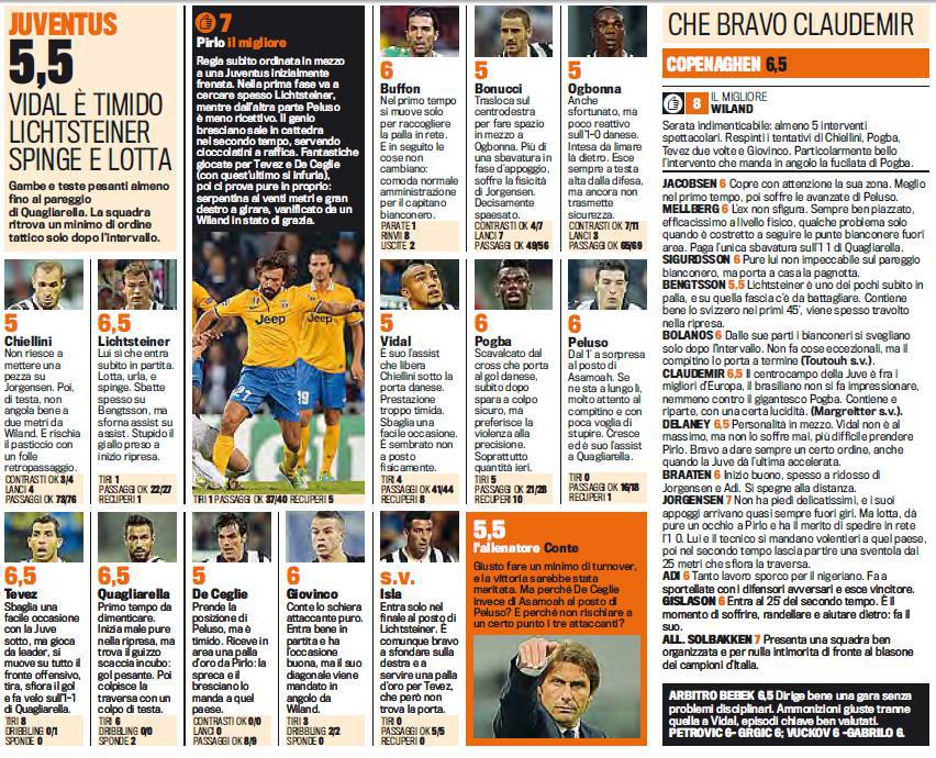 Copenaghen-Juventus, voti e pagelle Gazzetta dello Sport: Wiland fa paura! Pirlo torna genio, che delusione Vidal e la difesa!