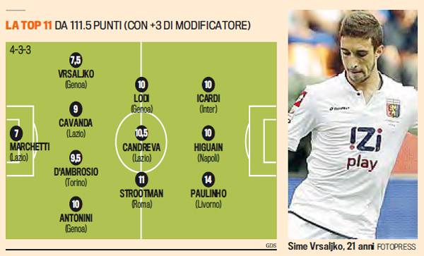 FANTACALCIO TOP 11 GAZZETTA PAULINHO PUNTEGGIO – La Gazzetta dello Sport ha stilato la top 11 della terza giornata di campionato. Si parla di Fantacalcio con la migliore squadra possibile. In porta super Marchetti, difesa a quattro con Vrsaljko e Antonini del Genoa sulle fasce, D’Ambrosio e Cavanda al centro. Centrocampo con Lodi, Candreva e Strootman, attacco atomico con Icardi, Higuain e Paulinho. Quest’ultimo vero fenomeno e mattatore della giornata con 14 punti frutto della doppietta contro il Catania. Una squadra da 111,5 punti, un punteggio sicuramente spaventoso. La difesa poi ha fruttato anche i tre punti del modificatore.