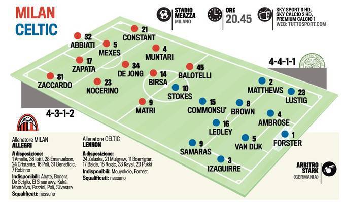 MILAN CELTIC PROBABILI FORMAZIONI ALLEGRI KAKA’ FOTO – Questa sera il Milan affronterà in casa il Celtic e visti i tanti indisponibili il tecnico Allegri dovrà fare di necessità virtù. Mancherà Kakà per il noto problema muscolare, al suo posto Allegri ha scelto di inserire Birsa, giocatore arrivato dal Genoa. Sarà lui a fare le veci del brasiliano. In attacco confermata la presenza di Balotelli, accanto a lui giocherà Alessandro Matri, attaccante ex Juventus, che cercherà di regalare la prima gioia ai tifosi del Milan. Ecco le probabili formazioni secondo Tuttosport.
