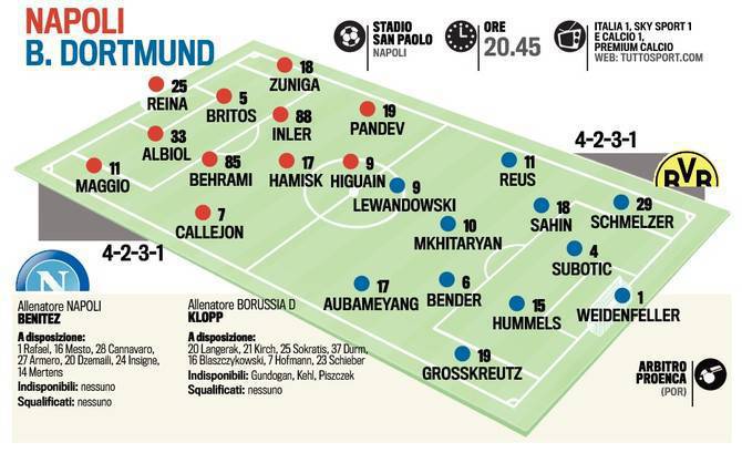 NAPOLI BORUSSIA DORTMUND PROBABILI FORMAZIONI BENITEZ ATTACCO FOTO – Il Napoli questa sera affronterà al San Paolo il Borussia Dortmund in un match sicuramente difficile e importante. Sarà la prima giornata di Champions League, per questo Benitez non vuole sbagliare. Il tecnico spagnolo ha deciso di sorprendere tutti buttando nella mischia un giocatore come Goran Pandev, calciatore macedone che dovrebbe giocare al posto di Lorenzo Insigne. L’ex calciatore dell’Inter dovrà cercare di fare bene per dare ragione a Benitez. In difesa torna Britos con Albiol. Ecco le probabili formazioni secondo Tuttosport.