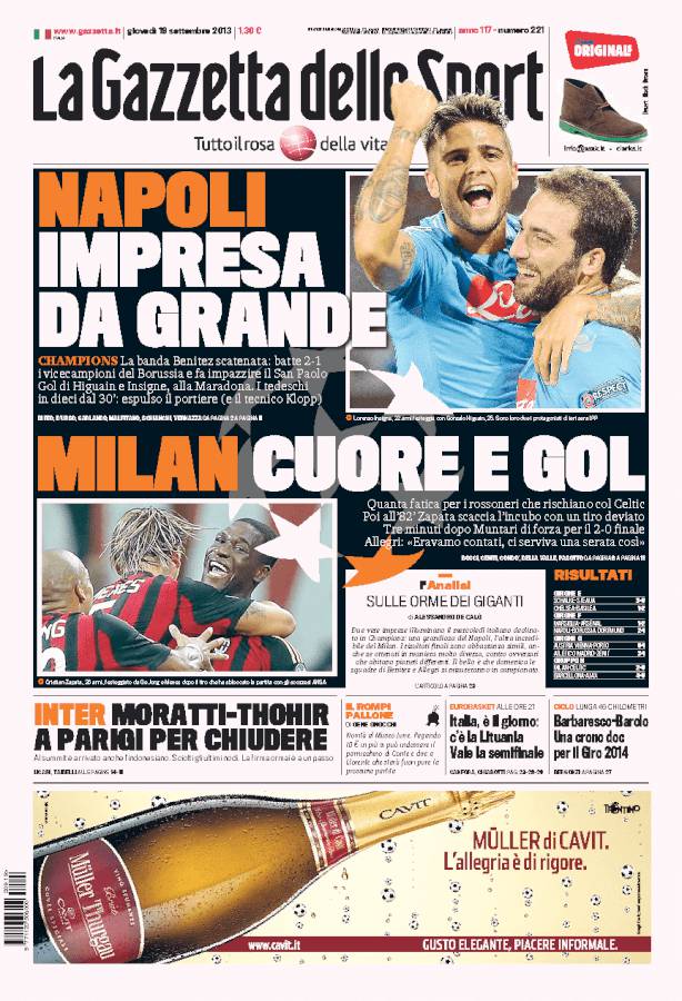 GAZZETTA NAPOLI – Il Napoli vince due a uno contro il Borussia Dortmund, a segno Higuain e Insigne. Il Milan vince due a zero contro il Celtic soffrendo tanto.