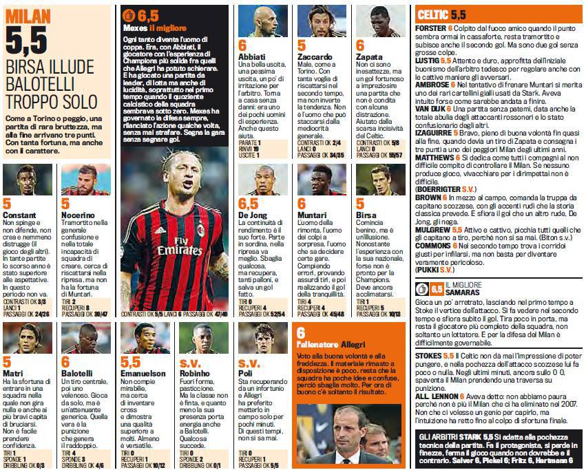 MILAN CELTIC VOTI PAGELLE GAZZETTA SPORT – Eccovi le pagelle e i voti firmati Gazzetta dello Sport di Milan-Celtic, gara giocatasi ieri sera a San Siro e conclusasi con il risultato di 2 a 0 per i rossoneri. Il Diavolo fatica ma alla fine trova i tre punti grazie ai gol un po’ inattesi di Zapata e Muntari. Migliore del match è Mexes, una vera e propria saracinesca ieri sera. Deludono invece sia Birsa quanto Alessandro Matri, molto attesi durante il match di ieri contro il Celtic. Solo 6 per Balotelli, da cui ci si aspetta molto di più.