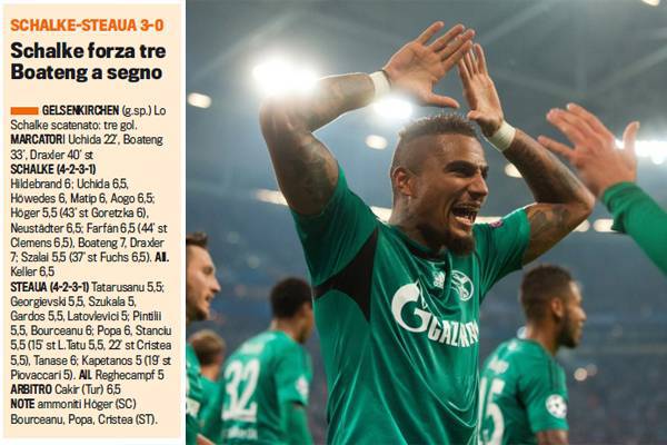 SCHALKE STEAUA GAZZETTA VOTI PAGELLE BOATENG – Altro giro altra corsa altro gol. Si tratta di Kevin Prince Boateng, che da quando ha lasciato il Milan per giocare nello Schalke, ha iniziato a segnare con regolarità. Prima il favoloso gol in campionato, ieri quello in Champions League contro lo Steaua per il tre a zero finale dei tedeschi. In gol anche Uchida e Draxler. Boateng super protagonista di una prestazione davvero importante, mentre lo Steaua non riesce a fare male ai tedeschi. Ecco i voti e le pagelle della Gazzetta dello Sport.