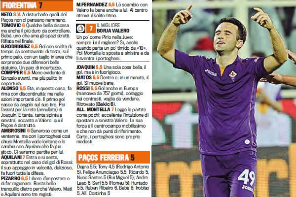 FIORENTINA PACOS DE FERREIRA VOTI PAGELLE GAZZETTA BORJA VALERO – Una Fiorentina pimpante batte tre a zero il Pacos de Ferreira, formazione portoghese. La Fiorentina di Montella dimostra di essere in forma e infatti si vede. Migliore in campo un mobilissimo Borja Valero autore di una bella partita sia da centrale che da esterno sinistro. Bella prova anche di Giuseppe Rossi che segna anche un gol. L’unica nota dolente è Joaquin che non riesce a entrare in forma e a mostrare segnali di risveglio. Per lo spagnolo prova rimandata. Ecco i voti e le pagelle della Gazzetta dello Sport.